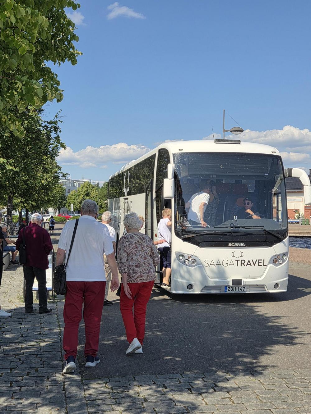 Matka alkoi Oulun linja-autoasemalta Saga Travelin bussilla klo 7.00, kempeleläisten liittyessä seuraan Zeppelinin pysäkiltä. Ryhmän koko oli 32 henkeä, joista neljätoista Kempeleestä ja loput Oulusta. Matka eteni mukavasti ilmastoidussa bussissa ensimmäiselle tauolle Iisalmen ABC:lle aamukahville.