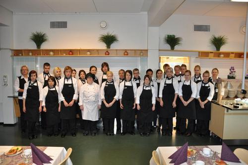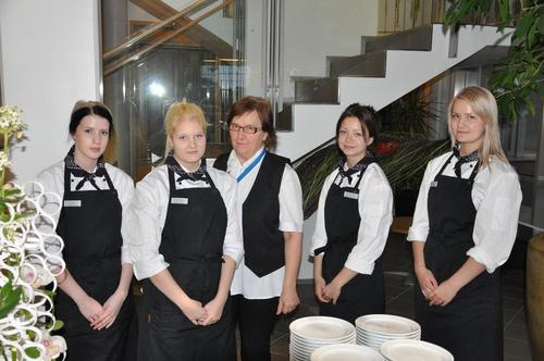 Koulutuskeskuksen erinomaisten tilojen lisäksi meillä oli mahdollisuus järjestää ruokailu tyylikkäästi pöytiin tarjoiltuna. Tämän kiitosta saanut järjestely toteutui ravintolalinjan opiskelijoiden ja heitä ohjaavien opettajien toimesta.