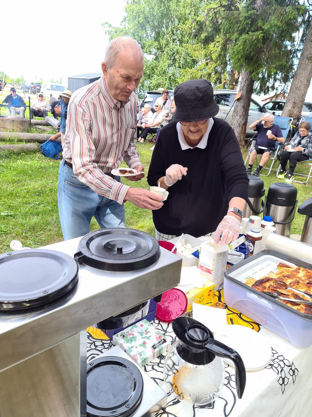 Kirsti Helenius ja Jouko Etelä möivät arpoja, jotka menivätkin hyvin kaupaksi. Arpajaisten pääpalkintona oli Tuulikki Alaräihän leipoma mansikkatäytekakku. Arvonnassa kakun voitti Anja Lauronen.